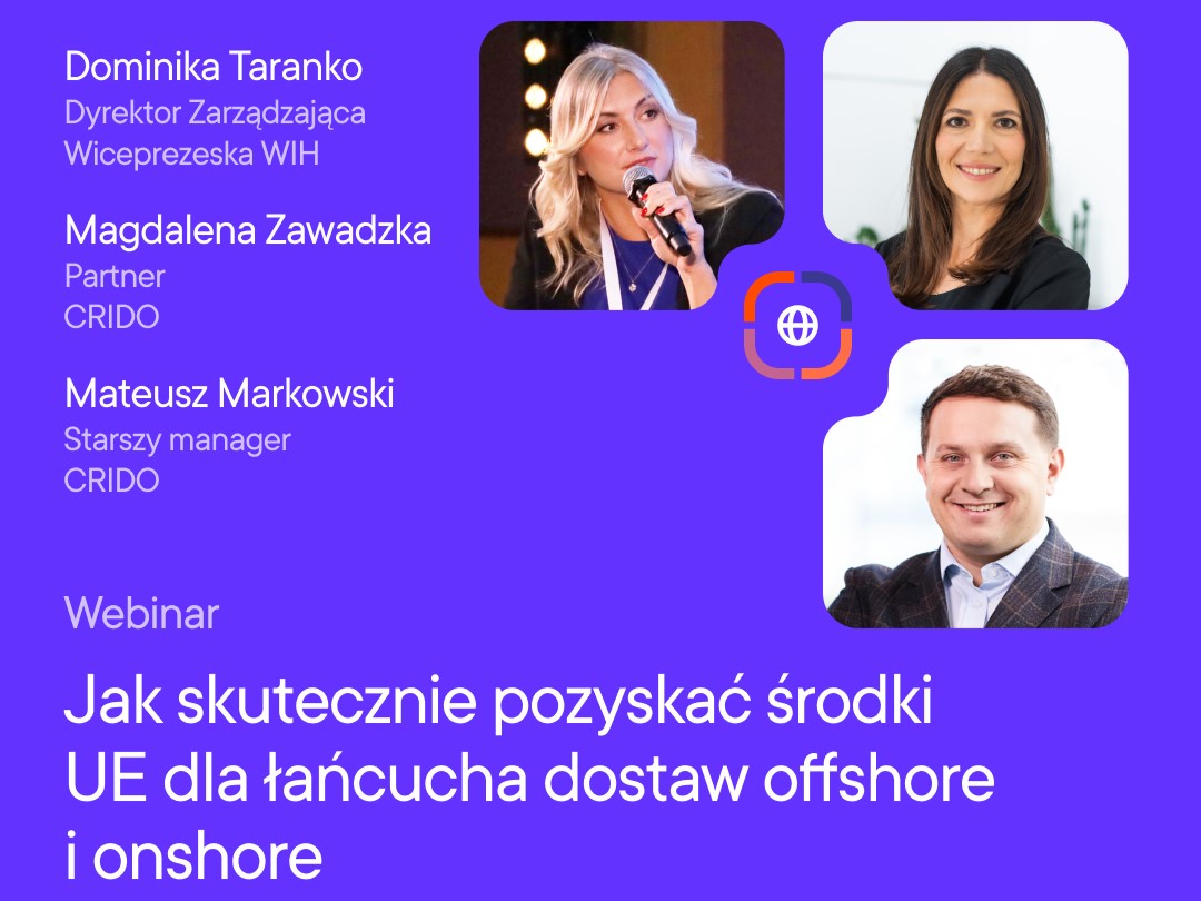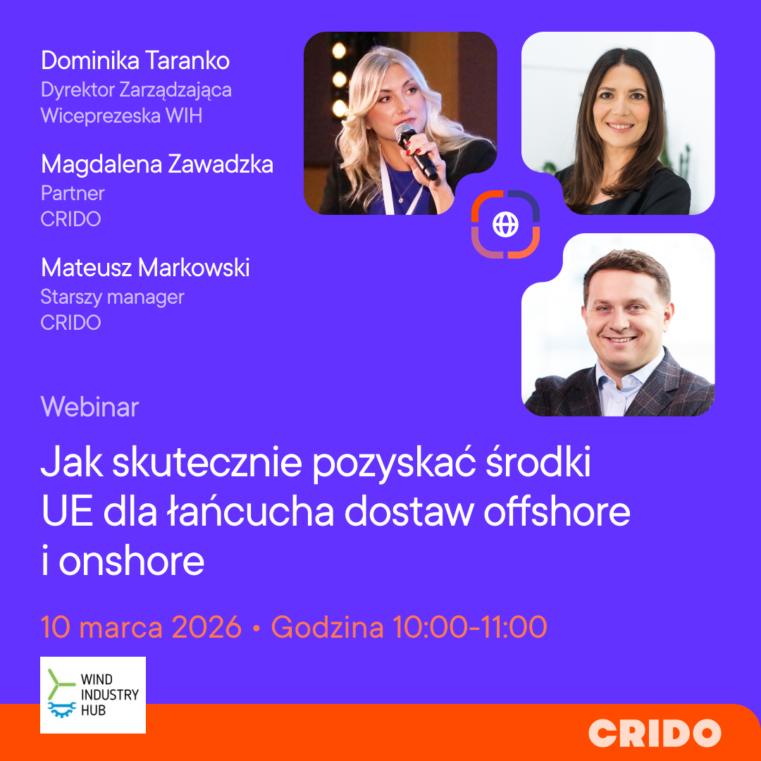 Wind Industry Hub oraz wiodąca firma doradcza CRIDO zapraszają na praktyczne webinarium, podczas którego opowiemy, jak skutecznie pozyskiwać środki unijne na projekty dotyczące łańcucha dostaw dla sektorów offshore i onshore. Skupimy się zarówno na projektach badawczo‑rozwojowych, jak i inwestycyjnych, obejmujących opracowanie lub wdrożenie produktów końcowych oraz elementów łańcucha dostaw.